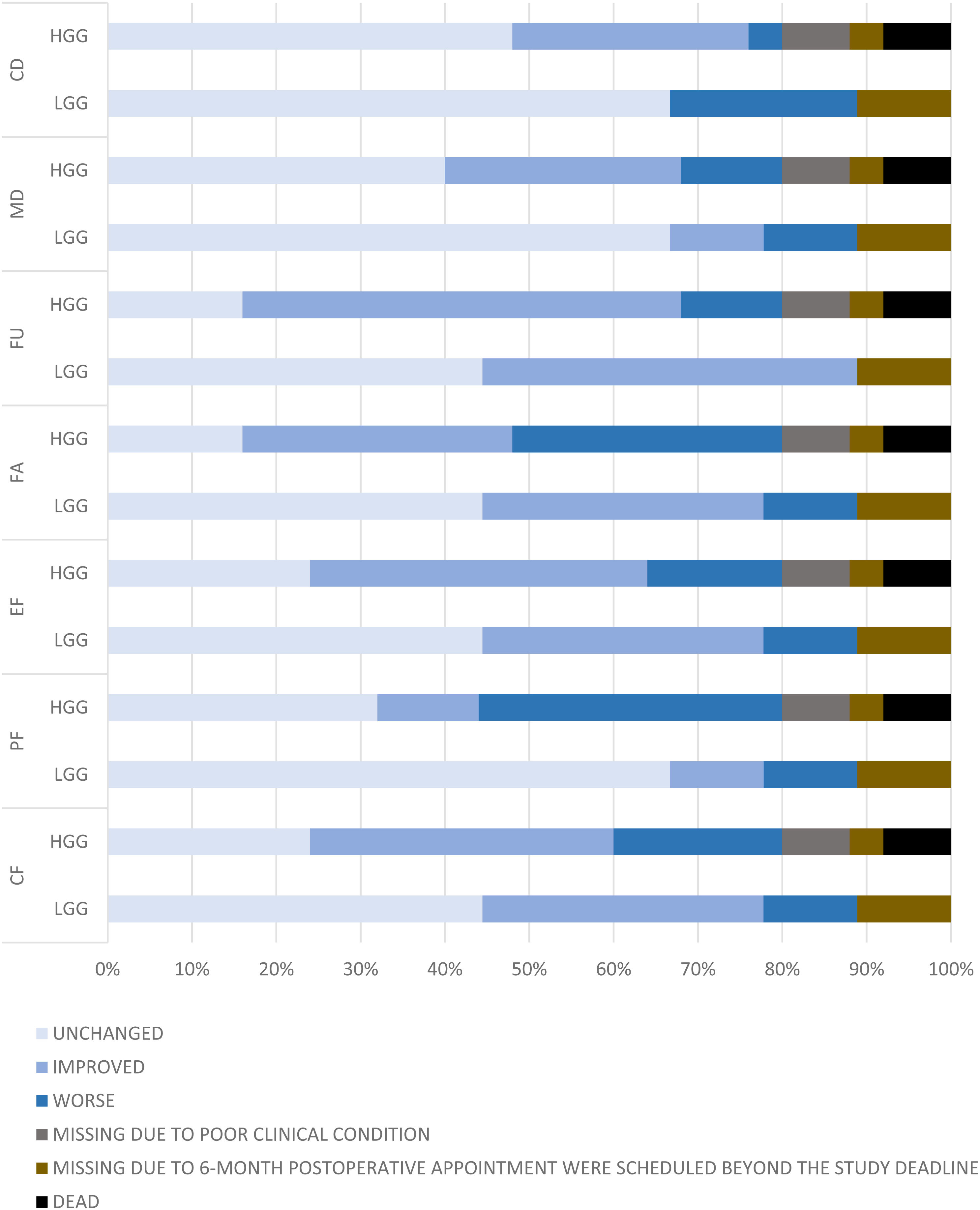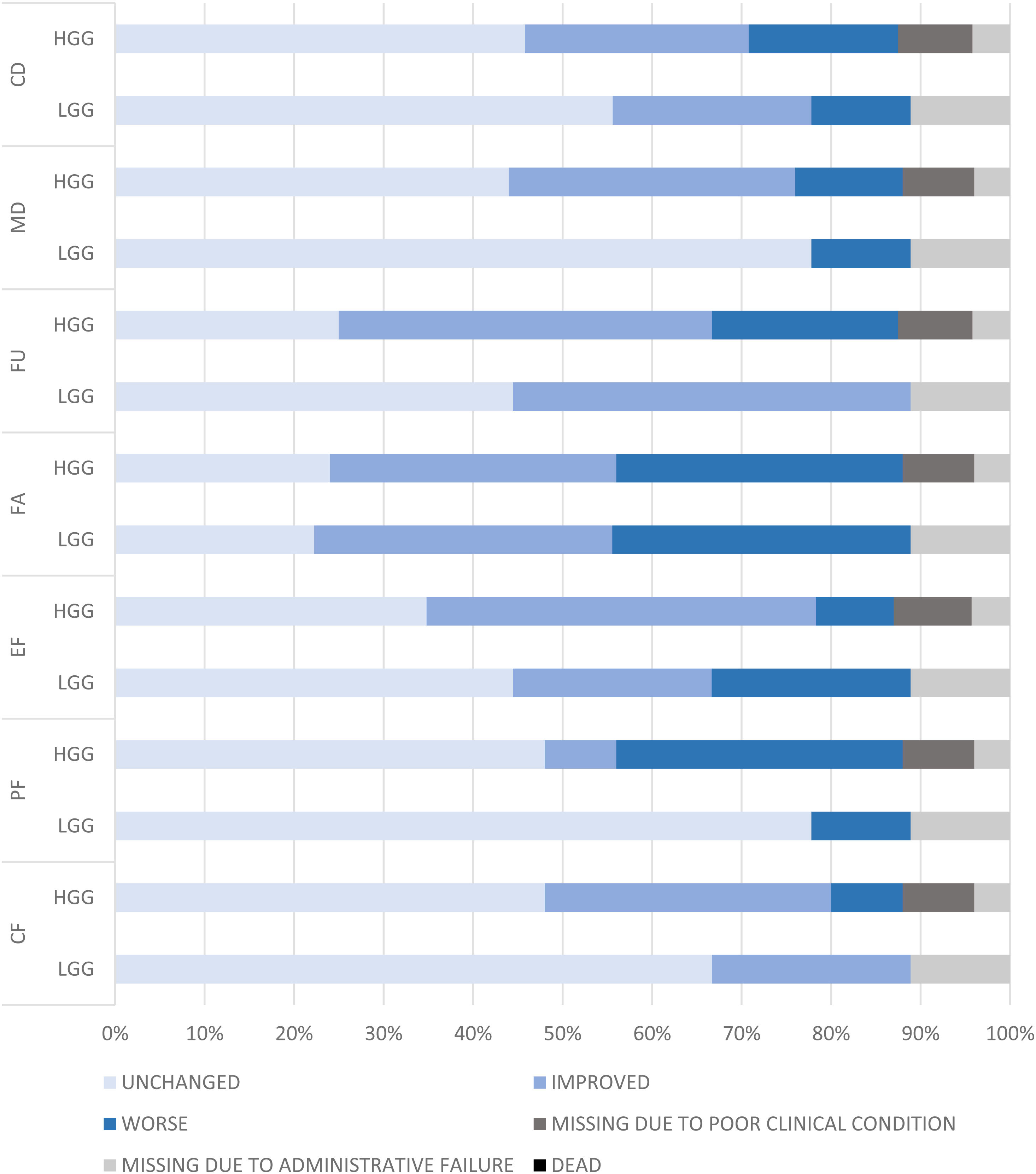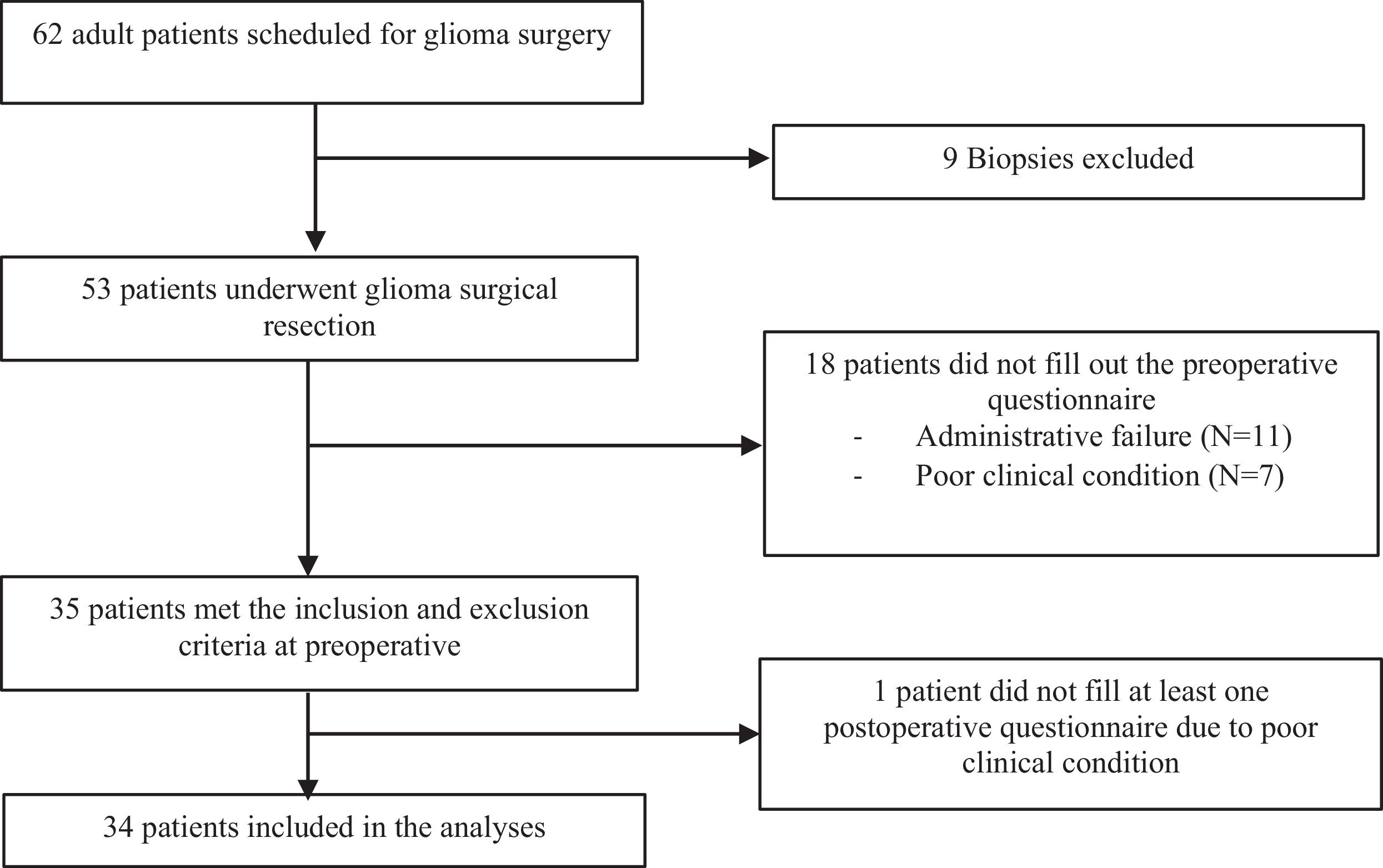 ResultsWe evaluated 34 patients (LGG-9; HGG-25). There were no differences in QoL at all evaluation time points between LGG and HGG groups. Within the LGG patients, QoL scores remained stable throughout 1- and 6-month evaluations. In patients with HGG, when compared to baseline, there were no meaningful variations in QoL at 1 month, but a clinically and statistically significant improvement (p=0.035) was found at 6 months. Total resection was associated with improved QoL in HGG patients at 6 months (p=0.025). At individual level, considering a minimum clinically significant value of 10, most HGG patients improved their QoL, while most LGG patients remained stable. Regarding subdomain analysis, a clinically and statistically significant improvement in future uncertainty was found in both LGG (p=0.042) and HGG (p=0.024) patients at 6 months.