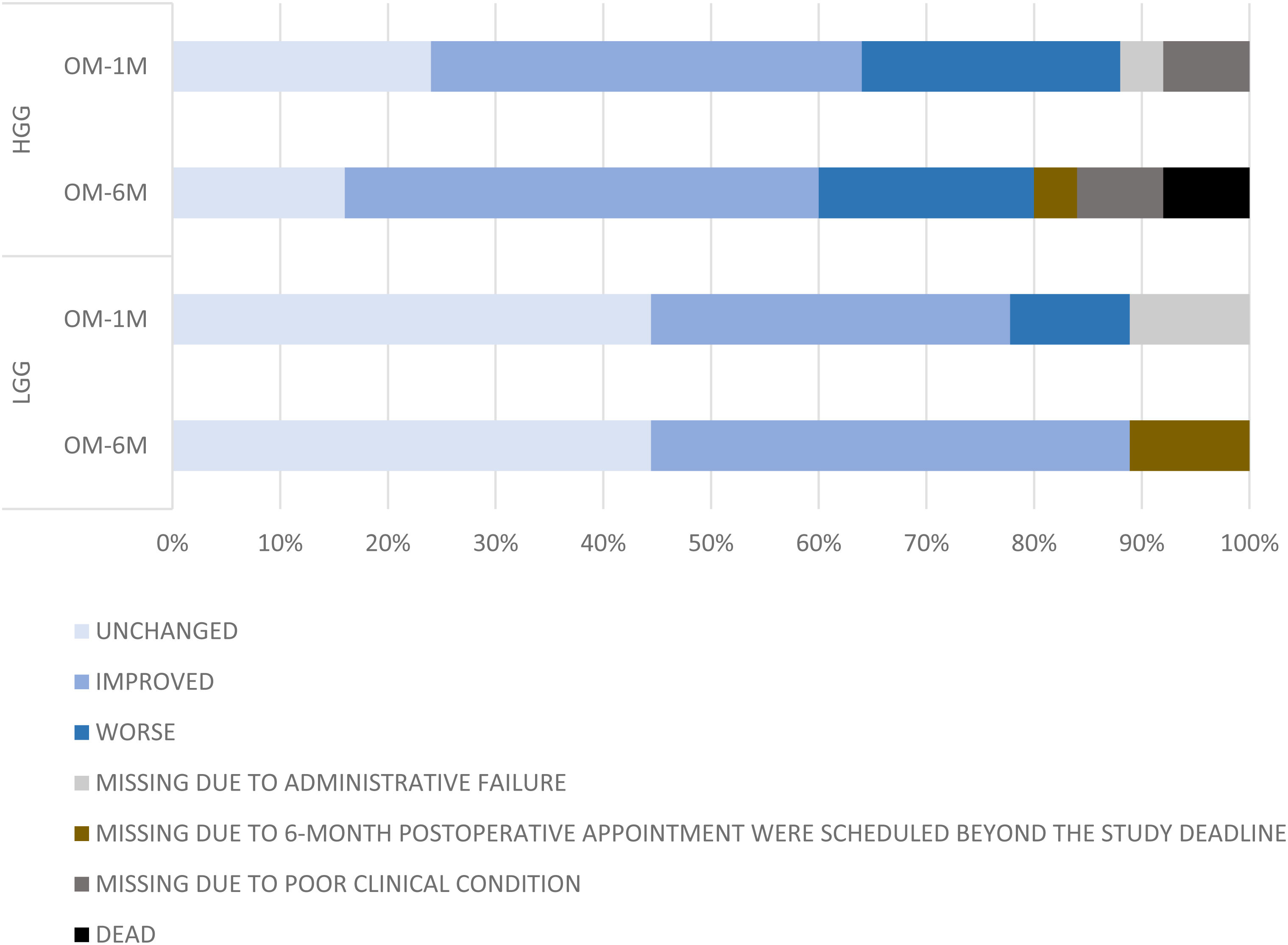MétodosSe incluyeron prospectivamente pacientes sometidos a resección quirúrgica de glioma de bajo grado (GBG) o de alto grado (GAG) desde enero de 2022 hasta diciembre de 2022. Para analizar la CdV informada por los pacientes, se utilizaron los cuestionarios EORTC QLQ-C30 y BN20, aplicados en el preoperatorio al mes y a los 6 meses de la cirugía.